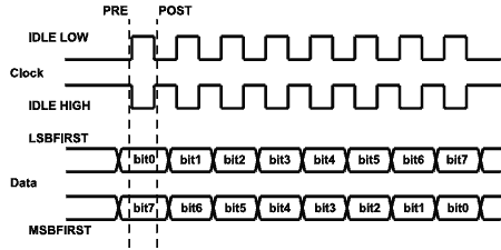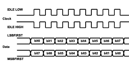 Modes 0-3, the clock idles low, toggles high to clock in a bit, and then returns low. For Modes 4-7, the clock idles high, toggles low to clock in a bit, and then returns high.|